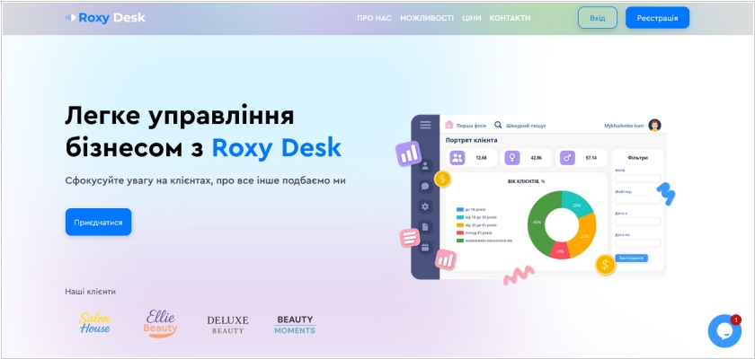 Roxy Desk - нова українська CRM/ERP-платформа для управління сервісним бізнесом (салони краси, клініки, барбершопи, медичні та косметологічні центри). Система автоматизує роботу з клієнтами та візитами, розклад та ресурси, нарахування та оплату, документообіг, аналітику та маркетинг. Інструменти розсилок, програми лояльності та нагадувань допомагають утримувати клієнтів та збільшувати повторні візити. Roxy Desk підтримує мережну структуру з філіями, ролі та права доступу, інтеграції з платіжними системами та аналітикою. Дані зберігаються безпечно, а українська локалізація та підтримка забезпечують швидкий старт та комфорт у повсякденній роботі. Є безкоштовна версія на 2 співробітників, а платна починається від 15 євро/міс до 5 співробітників.