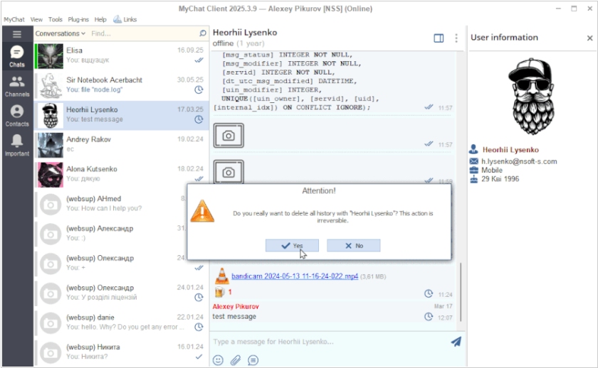 Український корпоративний месенджер MyChat додав можливість (для адміністратора) повністю видалити всю історію в конференції або в особистому діалозі. Повідомлення видаляються фізично назавжди з усіх клієнтських пристроїв та базі даних сервера. Також у новій версії з'явилася підтримка QR/штрих-кодів. Тепер ви можете сфоткати код смартфоном та відправити автоматично оброблений код у чат, де його може перехопити скрипт на сервері та обробити так, як вам потрібно. Розширено можливості імпорту історії зі Skype. Крім того, тепер можна миттєво перейти до приватного діалогу з роботом (Elisa, UIN=0) у будь-якому місці програми. Таким чином, легко виконувати команду бота або запустити потрібний вам скрипт, не витрачаючи час на пошук роботи в приватних діалогах або конференціях.