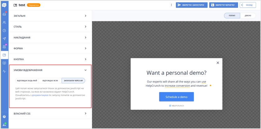 В онлайн чаті для сайтів HelpCrunch з'явилася можливість запускати попапи через JavaScript API. Якщо ви вибираєте цю опцію, попап запускатиметься програмно – за допомогою JavaScript на вашій веб-сторінці, де встановлено віджет HelpCrunch. Це означає, що тепер ви можете спілкуватися з клієнтами через попап, як самі забажаєте, без обмежень до логіки запуску, які є в HelpCrunch. Але власна логіка теж стала гнучкішою: в налаштуваннях з'явився параметр «Запускати коли» з наступними умовами: команда онлайн, команда офлайн, команда онлайн або офлайн (завжди). З цим оновленням перевірка доступності застосовується першою, перед тригерами та умовами, що допомагає запобігти непризначенню чатів, коли користувачі залишають діалог посеред ланцюжка.
