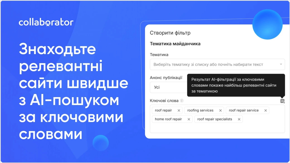 У маркетинговому сервісі Collaborator, який дозволяє публікувати прес-релізи на інформаційних сайтах, у блогах та телеграм-каналах, з'явився новий функціонал - AI-фільтрація за ключовими словами. Вона допомагає знаходити сайти за семантичною релевантністю контенту, а не лише за категоріями. Ви можете додати одне або кілька ключових слів (наприклад, "ремонт даху авто", "акумулятор для авто"), а також вказати потрібну країну або мову. В результаті ви можете за кілька секунд знайти несподівані можливості для розміщення контенту, на пошук яких зі стандартними фільтрами за категоріями та країнами пішло б набагато більше часу.