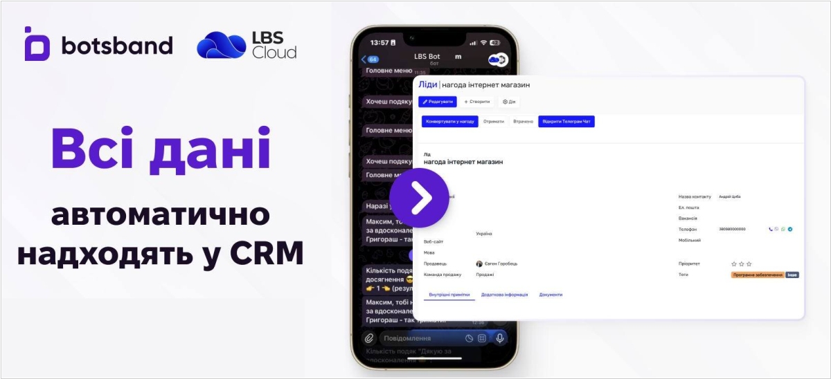 Команди BotsBand та LBS Cloud реалізували інтеграцію своїх рішень: чат бота та CRM системи. В результаті реалізовано коректну передачу даних з бота відразу в єдину бізнес-систему без ручної роботи та дублювання. Коли клієнт пише в бот (наприклад, у Телеграмі) - його звернення відразу стає частиною керованого процесу: від першого контакту до фінансового результату. Спочатку бот уточнює, що потрібно клієнту і одночасно збирає дані з допомогою форм з варіантами відповідей. Всі дані автоматично зберігаються у CRM. Зі звернення можна одним кліком створити новий лід або прив'язати чат до картки клієнта, поставити завдання менеджеру, направити в потрібний процес або чергу.