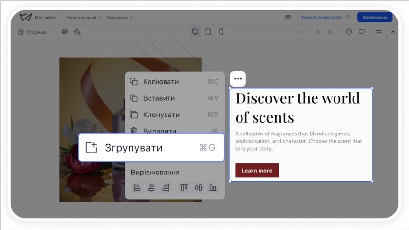Тепер у конструкторі сайтів Weblium ви можете створювати групи елементів у Flex block – це дозволить вам оптимізувати час роботи над сайтом та зробить взаємодію з абсолютними елементами ще зручнішим. Щоб створити групу елементів у Flex block, виділіть за допомогою курсору необхідні елементи, натисніть іконку з трьома точками та оберіть «Згрупувати». Також можна використовувати комбінацію Ctrl/Cmd+G. Можна переміщувати групу елементів, редагувати елементи всередині групи, а також змінювати розмір та пропорції для деяких елементів.