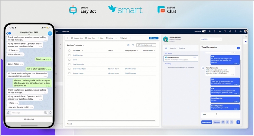 Досі в SMART CRM модулі SMART Chat (чат з оператором) та SMART Easy Bot (автоматичний чат-бот) функціонували окремо один від одного. Тепер вони працюють разом: клієнт починає взаємодію з кнопками або елементами сценарію SMART Easy Bot, які запускають певні дії чи відповіді роботу. Якщо потрібна допомога оператора, достатньо натиснути кнопку «Поговорити з оператором» та система автоматично перемикає клієнта на чат. У цей момент повідомлення потрапляє до SMART Chat, оператор бачить ім'я клієнта та канал звернення, може відкрити контактну картку. Оператор може надсилати автоматичні повідомлення про привітання, статус сесії, графік роботи, шаблонні відповіді, створювати або оновлювати в CRM безпосередньо під час діалогу.